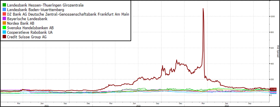 The lag in credit rating changes compared to credit default swaps is clearly illustrated by Credit Suisse. From 2021, the bank’s CDS spreads began to climb after a series of scandals, while its credit ratings remained anchored in investment grade. In March 2021, Credit Suisse lost around $5.5 billion in the collapse of Archegos Capital, having failed to cut exposures as swiftly as peers, yet rating agencies left its ratings unchanged. Throughout 2022, macroeconomic shocks a profitability pressures pushed CDS spreads sharply higher - rising from 55 at the start of the year to 448 by late November - while ratings slipped only gradually to the lower end of investment grade. By 2023, CDS spreads spiked further to 1,100, offering a real-time signal of deteriorating credit quality, compared to peers trading below 100, finally forcing downgrades. CDS markets thus provided a real-time warning of Credit Suisse’s deteriorating creditworthiness, while ratings lagged significantly and never fell below investment grade.