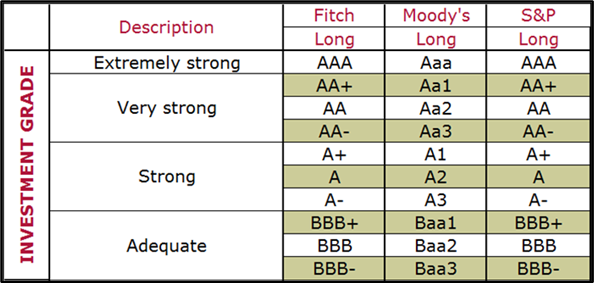 Investment grade ratings indicate a relatively low risk of default and are typically required for institutional portfolios that prioritise capital preservation. These ratings range from the highest quality to adequate credit quality: