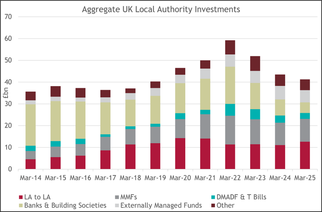 Moreover, LA-to-LA lending has also expanded in relative terms, contributing to a larger proportion of the UK local authority investment mix. In 2014, the investments made up a modest share of local authority portfolios – representing around 12.6% of total investments. However, in 2025 this has increased considerably, representing over 30% of the total £41.3bn invested.