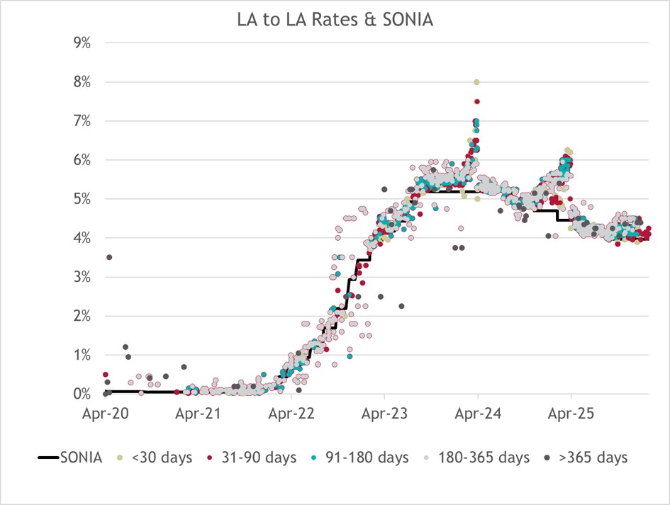 Further out, one-year LA borrowing has also crept up, with rates now being quoted up to 4.4%, broadly in line with the one-year PWLB certainty rate (4.38% at the time of writing) and equivalent to 1-year SONIA plus 90 basis points. At these levels, the traditional cost advantage of the LA-to-LA market over PWLB has narrowed considerably. That said, shorter-dated borrowing at a higher margin may still be acceptable where it provides certainty over year-end, provided elevated costs are not locked in for longer than necessary.