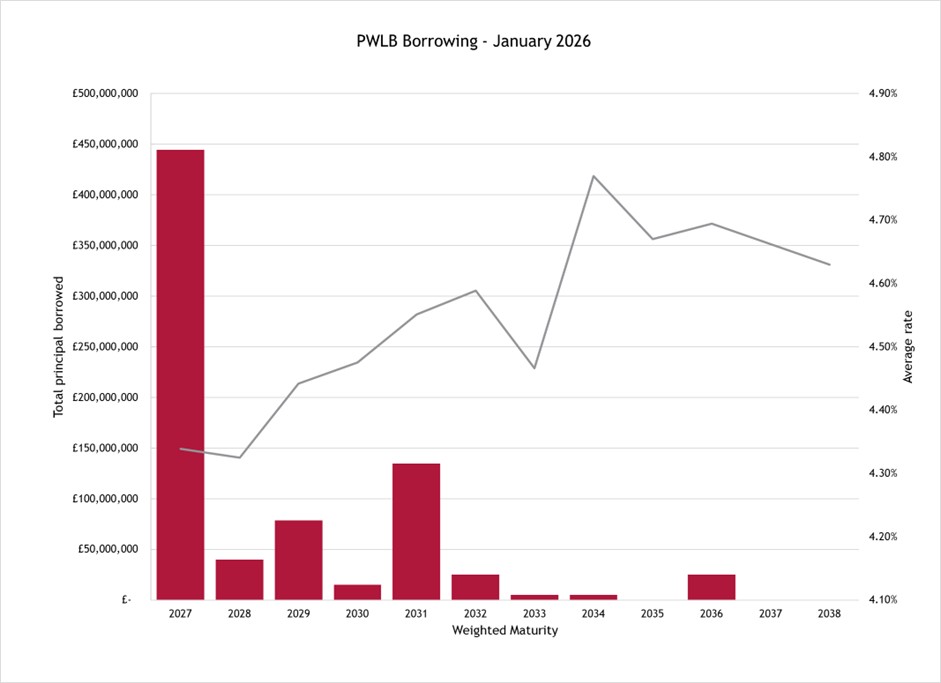 Borrowing data suggests that authorities have already begun to adjust. In January, £1.5bn was borrowed from the PWLB, with an average maturity of 2.4 years, shown in the chart below. This relatively short average life could indicate that the PWLB is being used tactically to supplement near-term funding requirements as an alternative to LA borrowing. It also highlights the continued role of PWLB as a stable and predictable source of liquidity when market conditions are less accommodating.