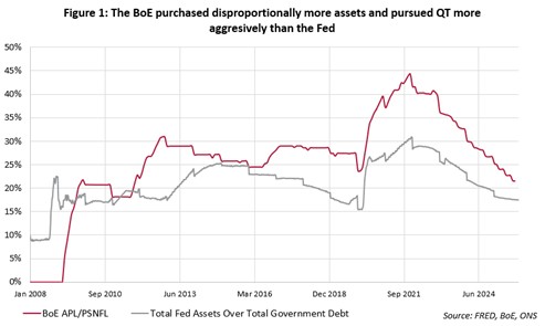 The Bank of England (BoE) claims that, unlike QE, which aimed to affect interest rates and growth, QT is intended to restore policy flexibility rather than act as an additional tightening tool. Even so, QT affects the economy by raising yields and reducing liquidity. The impact depends on the size and method of balance sheet reductions. Empirical work suggests QT has lifted gilt yields by 30-70bps, reflecting the BoE’s larger relative holdings and active sales, versus roughly 20bps at most across the US curve under passive QT.