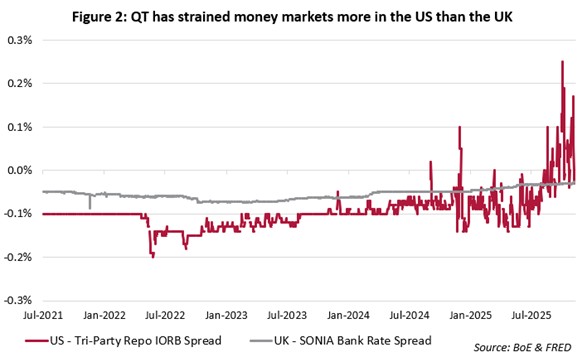For both central banks, QT can only proceed while they retain adequate control of the overnight rate. Once reserves fall close to the minimum level needed for those frameworks to function smoothly, QT must be slowed or stopped. This is what Figure 2 shows on the US side: as QT progressed, the spread between repo rates and interest on reserves widened, confirming that the system was approaching the lower bound of ample reserves, a sensitivity that reflects the more market-centred, non-bank-driven structure of US dollar funding markets compared with the more bank-centred sterling system. That dynamic was a key reason why the Fed ended QT in 2019 and again in December 2025.
